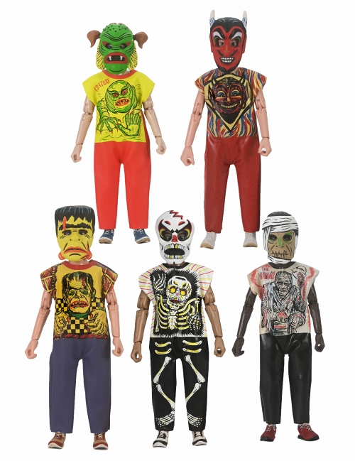 1950~80年代にかけて販売されていた、子供向けのハロウィン衣装の人気メーカー「ベン・クーパー」。そのベン・クーパーが手掛けたコスチュームたちをモチーフとしたネカの新シリーズ「ベン・クーパー コスチュームキッズコレクション」がスタートします。第1弾としてラインナップしたのはクリーチャー、悪魔、フランケンシュタイン、ミイラ、スケルトンのコスチュームキッズたち5人!オリジナルデザインのマスクとコスチュームの、ビニール風な雰囲気まで再現した、全高約15センチのドールとなります。それぞれにトリック・オア・トリート・バッグやパンプキン・バケツのアクセサリーが付属し、遊び心満載。当時のオリジナルのパッケージをオマージュした、レトロスタイルのウィンドウボックス仕様ボックスも注目!そのまま飾っても楽しめ、オリジナルへのリスペクトを感じるデザインが素敵です。