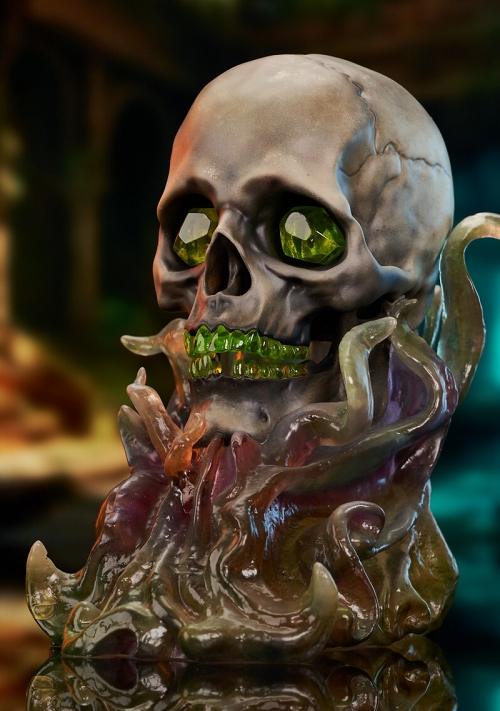 世界中で大人気のTRPG『ダンジョンズ&ドラゴンズ』より、歯と目に緑色に輝く宝石をあしらったスカル「デミリッチ」のダイスホルダーが登場です!こちらのデミリッチのレジン製レプリカは、全高約25センチとボリュームあるサイズで造形。スカルを取り外すことで台座の中にD&Dのロールプレイング用のサイコロを収納可能!ダイスホルダーとしてはもちろん、スタチューとしても存在感があり楽しむことができます。世界限定3000個となっている本アイテムで、よりハイクオリティなゲームプレイをご堪能ください。