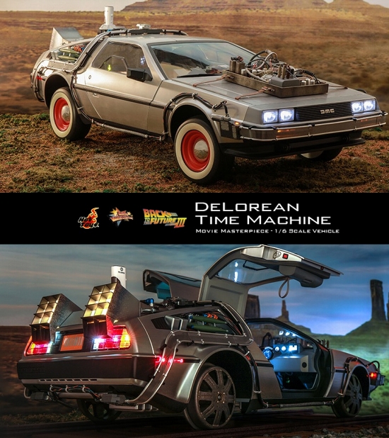 ホットトイズの「ムービー・マスターピース」シリーズに、公開から四半世紀が過ぎた現在もなお、世界中で愛され続けている名作SF映画『バック・トゥ・ザ・フューチャー』シリーズから、『パート3』版デロリアンが登場です。過去となる1885年に改造されたデロリアンを、全長約72センチ、全長約35センチ、全高約25センチという大迫力の1/6スケールモデル化。ボンネットに固定された装置、開閉可能なガルウイング、後部の超小型原子炉「ミスター・フュージョン」、側面のケーブル配線など、質感やディテールにこだわり、細部に至るまで精巧な仕上がりに。車体の表面は、削り出しのような金属感を演出し、さらにウェザリングも追加し質感を再現。ヘッドライトなどの各所にLED内蔵しライトアップも。タイヤはノーマルタイプから、線路上を走行するための車輪タイプへ差し替えが可能。ダッシュボードにはタイムサーキット、スイッチなどの計器、部座席の次元転移装置、ダッシュボードに蒸気機関車内のボイラーの温度を示すメーターなど、インテリアも細部まで再現。バンパー下部には牽引フックがマグネット式で着脱可能。