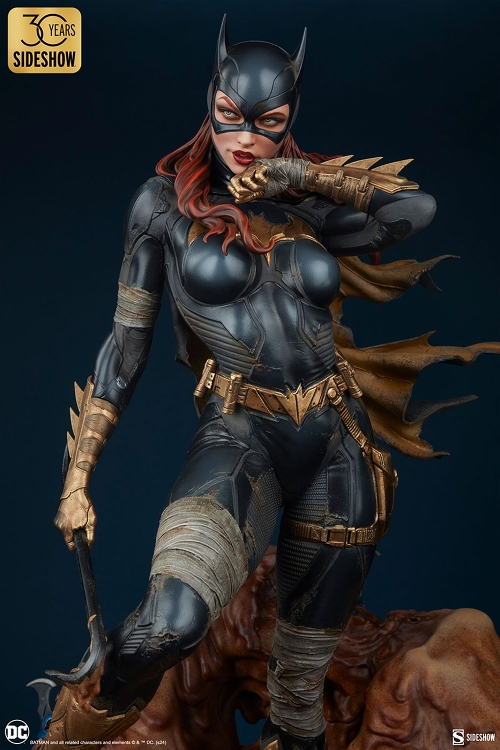 サイドショーの「DCコミックス」プレミアムフォーマットシリーズに、バットガールが三度ラインナップ!コミックス版のバットガールを、大迫力の高さ約55センチのスタチューとして立体化。黒金のコスチューム、激しい戦闘を感じさせるボロボロになったマントや、手足に巻いた包帯など、細部に至るまで精巧に造り込み。バットラングの電気ショック(青いライトアップ内蔵)でダウンしたクレイフェイスを台座に配置。バットマン、ナイトウィング、ジェームズ・ゴードンの顔に変形しかけた体表にも注目です。