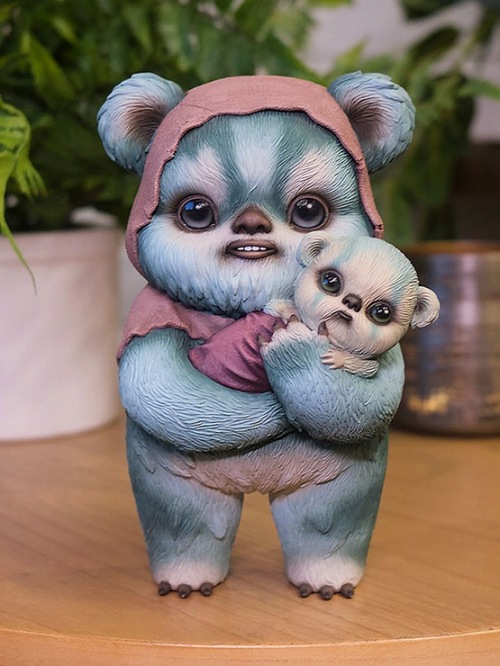 サイドショーの『スターウォーズ』フィギュアシリーズから、マブ・グレイブスによるイラスト「It Takes an Ewok Village」をデザイナーフィギュア化しました。科学、宇宙文化、おとぎ話、古典文学などに深くインスパイアされているという独特の世界観をアートにするマブ・グレイブス。ポップシュルレアリスムを得意とする彼女が描いたイウォークを、全高約18センチで立体化。大きなつぶらな瞳、パステル調のブルーの毛並み、それとコントラストを成すアースピンクのローブなど、アーティストのユニークなタッチを見事に表現。親イウォークが赤ちゃんイウォークを抱きかかえる姿がキュート!