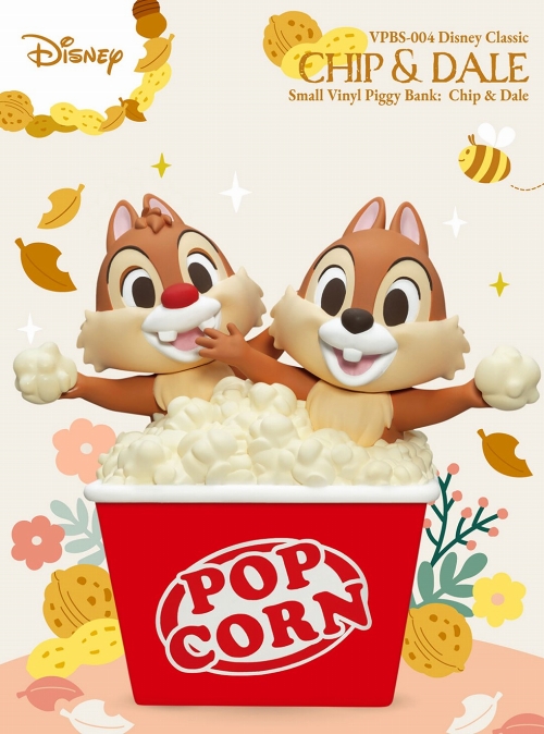台湾のメーカー、ビースト・キングダムがお贈りする、「スモールビニール貯金箱」シリーズに、ディズニーアニメから、チップとデールが登場です。ポップコーンカップに入ったチップとデールを、全高約24センチのビニール貯金箱として立体化。ポップコーンの中から笑顔で飛び出した2匹はとてもチャーミング。カップの背面からコインを入れることができます。貯金箱としてはもちろん、そのまま飾っても楽しいアイテムです。
