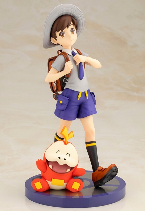 大人気ゲーム『ポケットモンスター スカーレット・バイオレット』より、ハルトとホゲータが、「ARTFX J」シリーズにラインナップ!ありがひとし氏による描き下ろしイラストをベースに、トレーナーとポケモンが仲睦まじい様子を、全高約20センチで立体化しました。パルデア地方での「宝探し」に胸を躍らせているようなポーズにワクワクとした表情!見ているだけで元気がもらえそうな仕上がりです。グレープアカデミーの制服やリュックは、リアルさを目指した造形と塗装で再現。足元でニコニコと笑うホゲータも可愛らしいシルエットです。