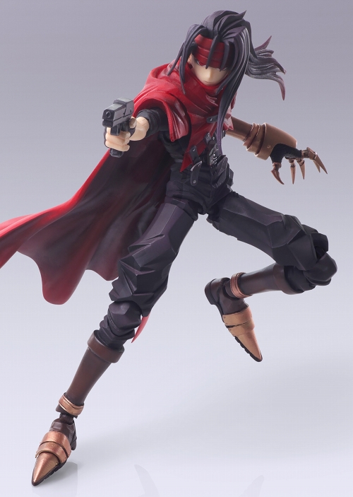手の平サイズの6インチ(全高約15センチ)というスケールながら、細部にまでこだわったスクウェア・エニックスのアクションフィギュアシリーズ「ブリングアーツ BRING ARTS」。『FINAL FANTASY VII』シリーズからヴィンセント・ヴァレンタインがラインナップです。造形はオリジナルの『FINAL FANTASY VII』に基づき、特徴的な長い髪、深紅のバンダナとマント、左腕に身に付けた金属質のガントレットなど、ヴィンセントの原点とも呼べる懐かしい姿を再現。マントの質感や服のしわなど、ディテールにもこだわっています。付属品にはヴィンセントの武器である銃と、その持ち手も含めた各種交換手が付き、劇中の様々な場面を表現可能。