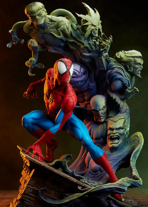 サイドショーの「マーベル」プレミアムフォーマットフィギュアシリーズに、マーベルコミックから、スパイダーマンのダイナミックなスタチューが登場です。スパイダーセンスで宿敵の接近を察するシーンを、大迫力の全高約53センチで立体化。目を見開き、臨戦態勢のスパイダーマンの背後には、「シニスター・シックス」のビジョンを造形。ドクター・オクトパス、エレクトロ、クレイヴン・ザ・ハンター、ミステリオ、ヴァルチャー、サンドマン…。今そこに迫ろうとしている敵の脅威を精巧な造形でみごと表現しています。台座は、レンガ造りの建物が造形されたジオラマ風に。親愛なる隣人として街の人々を守りたいという、ピーターの強い覚悟が伝わってくる仕上がりとなりました。