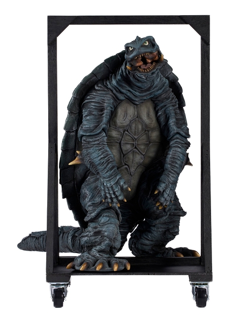 映画『ガメラ2 レギオン襲来』で実際に使用されたガメラのアップ用スーツを、173台の一眼レフカメラを用いて高詳細3Dスキャンを実施。その3Dデータを元に迫力の30センチサイズでADKエモーションズがフィギュア化しました。怪獣フィギュアと馴染みの深いソフトビニールにて実現。さらに実際のアップ用スーツの保管や搬入出で当時から使われていた専用台座を、本物と同じく木製にて再現し同梱。今回の前例のないフィギュア化は、フィギュアメーカー「STUDIO24」と、木材加工でアイデアをカタチにする工房「森工芸社」の協力を得て、ホンモノ同様の再現に成功した傑作です。