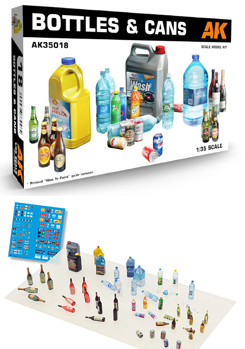 1/35スケールで350mlのプルトップ缶、瓶ビール、ワインボトル、大小のペットボトル、洗剤やオイルの大型ポリ容器などを60点も再現した、まさかのプラモデルキットがAKインタラクティブより登場!セットのデカールラベルでそれぞれを彩るも良し、ステッカーを自作するも良しなワクワクキット!他のフィギュアやプラモデルと組み合わせても楽しそうな予感しかしません!