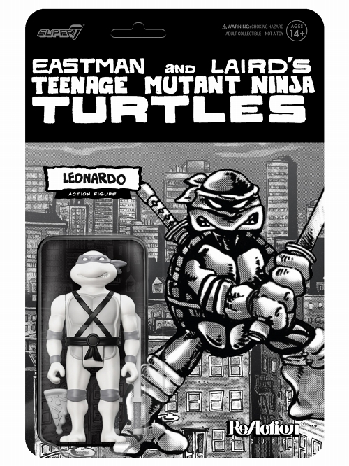 スーパー7のレトロポップな看板シリーズ「リ・アクション」同シリーズのご長寿ライン『TMNT』のWave9は、オリジンにあたる「ミラージュコミックス」にリスペクトを捧げたモノトーンでのリリースです!ガイズの生みの親である、ケヴィン・イーストマン氏とピーター・レアード氏の名前と共にオリジナルの絵柄があしらわれたバックカードは、ハードでクールな印象になりフィギュアそのものの印象も変わる素敵な仕様です。こちらはレオナルド、カタナとピザが付属します。