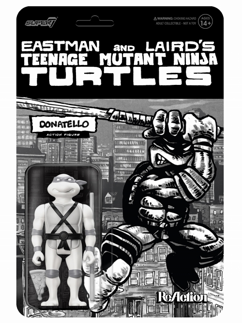 スーパー7のレトロポップな看板シリーズ「リ・アクション」同シリーズのご長寿ライン『TMNT』のWave9は、オリジンにあたる「ミラージュコミックス」にリスペクトを捧げたモノトーンでのリリースです!ガイズの生みの親である、ケヴィン・イーストマン氏とピーター・レアード氏の名前と共にオリジナルの絵柄があしらわれたバックカードは、ハードでクールな印象になりフィギュアそのものの印象も変わる素敵な仕様です。こちらはドナテロ、スタッフとピザが付属します。