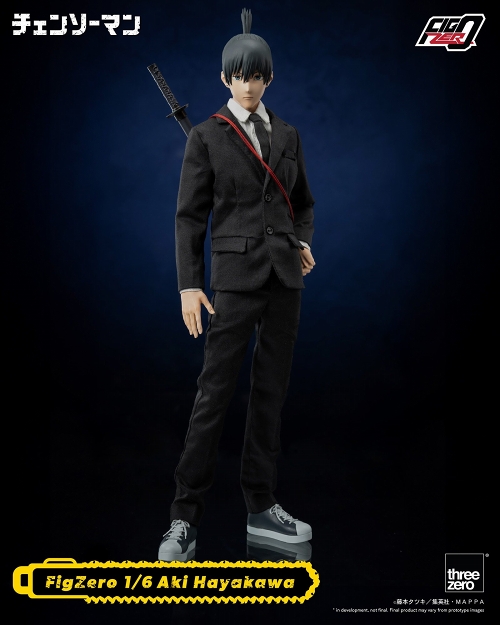 TVアニメ『チェンソーマン』よりフィグゼロ1/6スケール可動フィギュアシリーズから早川アキが登場!精密な頭部造形と手縫いの布製衣装により、TVアニメ劇中の姿をリアルに再現します。「フィグゼロ 1/6 早川アキ」は全高約30cm、全身に約35ヶ所の可動ポイントを持つフル可動フィギュアです。フィギュアの主な素材にはABS、PVC、POM。ジャケットを含む公安制服一式は布製です。ネクタイは中に金属線が仕込まれており、ポージングが可能です。表情パーツは交換式で、真顔としかめた顔の全2種類が付属。また、ポーズの異なる交換式手首パーツが全5種類付属します。他、刀(釘の形)とその鞘、ボディストラップ、刀とその鞘、そして銃の悪魔の肉片が付属。