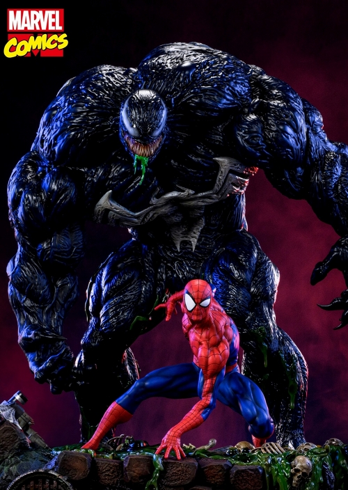 クイーンスタジオのスタチューシリーズ「コミッククイーン」第一弾は、マーベルコミックから!全高約36センチのスパイダーマン、全高約76センチのヴェノムを立体化したスタチューは1/4スケールの大型サイズ。エリック・ソーサとエミリアーノ・カルデロンを製作陣に迎え、両者の体格差やボディラインなど、コミックに忠実に再現しています。台座を分割仕様とすることで、スパイダーマンとヴェノムを個別にディスプレイも可能としました。プレミアムエディションではさらに差し替え頭部が付属!スパイダーマンとヴェノムそれぞれ頭部2種が用意され、アメコミらしい表情が楽しめます。全世界88体限定。