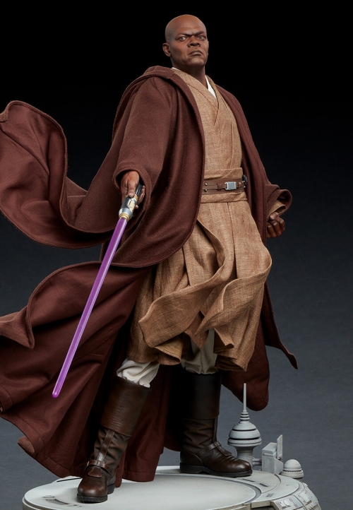 サイドショーの『スターウォーズ』プレミアムフォーマットフィギュアシリーズから、エピソードIII「シスの復讐」時のメイス・ウィンドゥがラインナップです。眼前にパルパティーンがいるかのような、臨戦態勢状態のメイスを、全高約53センチでスタチュー化。サミュエル・L・ジャクソン演じるメイスの頭部から、ワイヤー内蔵の布製ローブ、縫い目や質感がリアルに再現されたチュニックなど、細部に至るまで精巧に造り込み。手にしたブレード展開状態のライトセーバーには、LEDによるライトアップが内蔵。足元の台座造型は、これから戦場となる執務室、そのコルサントの元老院ビルをイメージさせます。