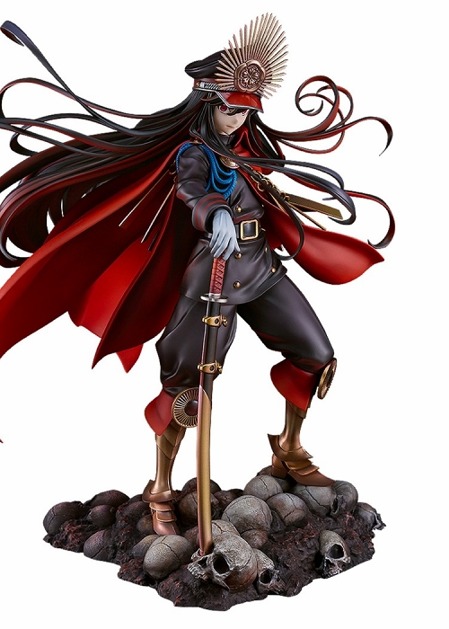 大人気スマホゲーム『Fate Grand Order』より、アヴェンジャークラスのサーヴァント「織田信長」を第一再臨の姿でスケールフィギュア化!鋭い眼光と不敵な笑み、圧倒的なカリスマ性を纏った「第六天魔王」をイラストに忠実に再現いたしました。燃え盛る炎の中の堂々たる立ち姿を情景ごと再現すべく黒髪や軍服には「赤」の照り返しを効果的に入れ、無尽の屍を表現した髑髏の台座は土の質感や汚し表現をリアルに臨場感たっぷりに仕上げています。ブーツや刀の鞘には幾層にも色を重ねたメタリック塗装を施し、鈍く輝く金属の質感を表現。360度どこからみても威厳を感じる造形と高度な彩色技術によって緻密に再現されたこだわりのノッブを是非マスターのみなさんの元にお迎えして欲しいのじゃが、じゃが。