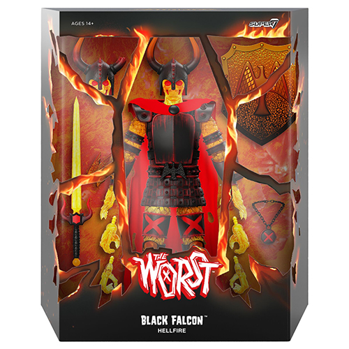 スーパー7の贈る80s感を詰め込んだ、最高で最低の奴ら「ザ・ワースト」のアルティメイトフィギュアシリーズから、不死のアンデット将軍、ブラックファルコンがヘルファイアVer.で登場です。その名の通り、地獄の業火すら及ばないブラックファルコンの煮えたぎる怒りは、彼がどこに行こうとも共に痛み、恐怖、死すらもたらす…。そんな危険すぎるヘルファイアなブラック・ファルコンをクリアオレンジのボディにレッド、イエロー、ブラックのプレミアムなペイントで表現。アンデット将軍の燃えるような破滅的衝動は留まるところを知りません!