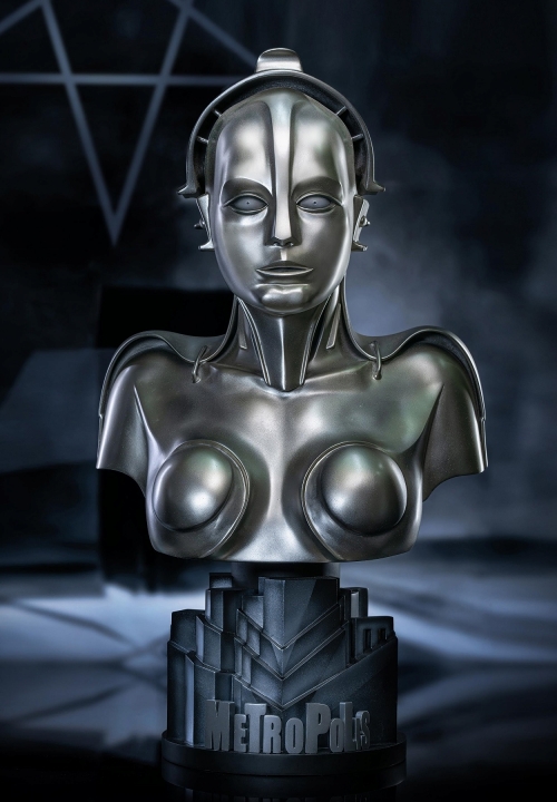 フリッツ・ラング監督制作で1927年に公開されたドイツの無声映画『メトロポリス』。ウォルター・シュルツ=ミッテンドルフが造形し、創り上げた機械人間(アンドロイド)のマリア、その起動時の姿をバストアップモデル化しました。接続された何本ものケーブルに電流が流れ、幾多の光輪が激しく交差し、心臓が鼓動。ついにマシーネンメンシュにマリアの容姿が転送され起動するシーンは、劇中で最も印象深く、さらにSF映画史に残る名場面と言えるでしょう。今回のバストアップモデルは1/2スケールと大型に。ベース部のデザインに採用されたモチーフは、当時の映画ポスター!ファンにはたまらない逸品となりました。