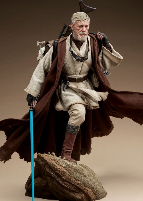 「ありえたかもしれない、しかし、なかったかもしれない」と受け手側に想像される「余白」を生む、心で完成させるシリーズとしてサイドショーが定義。オリジナルの解釈が加えられた、サイドショーの『スターウォーズ』ミュトス/ミトスシリーズ。新作としてラインナップしたのは、プレミアムフォーマットラインによるオビ=ワン・ケノービです。アナキンとクワイ=ガンのライトセーバー、タスケンレイダーのライフル、通信機などをまとめたバックパックを背負った姿を、全高約53センチで立体化。頭部は差し替え式で、EP3「シスの復讐」、EP4「新たなる希望」をイメージしたものに変更が可能です。右手に持ったライトセーバーは、LED内蔵でブルーの光刃が発光します。砂地の岩場をイメージさせるジオラマ風台座も雰囲気を盛り立てます。