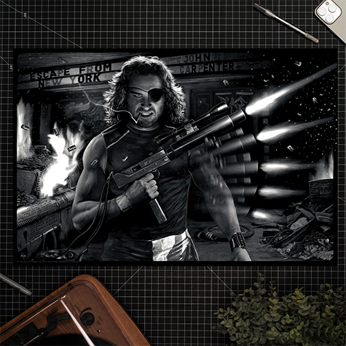 フランス出身のイラストレーター、マット・ペックが手掛け、MONDO(モンド)などにアートを提供するエルヴィスデッドにより描かれた、ジョン・カーペンター×カート・ラッセルがタッグを組んだカルト的人気を誇る映画『ニューヨーク1997』のアートプリントがサイドショウより登場です。大統領救出のため犯罪増加率が400%を突破し重犯罪者たちが集められたニューヨーク・マンハッタン島に単身乗り込むスネークの鬼気迫る表情が表現された一枚。こちらは、バリアントとして白×黒で描かれた渋めなアートになっており、サイズも通常のアートプリントより大き目サイズとなっております。