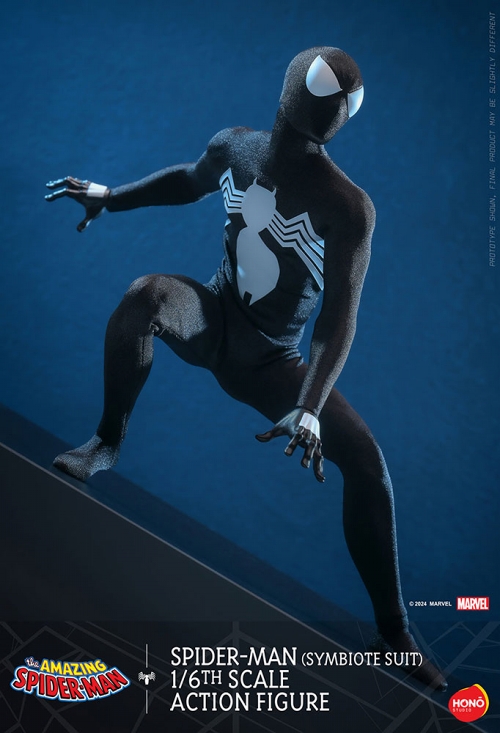 「忠実再現」とは一線を画す、大胆さと革新性を追究。発売までの期間が短く、マスターピースシリーズと比べるとお手頃なプライス帯。ホットトイズの1/6スケールフィギュアブランド「炎スタジオ」から、シンビオートスーツ版スパイダーマンが登場です。コミック版の「ブラックコスチューム」を、全高約30センチ、30箇所以上可動のフィギュアとして立体化。スーツは布製で、胸元と背中に白い蜘蛛マークがプリント。頭部は眼部パーツが差し替え可能。スパイダーウェブで作られたバックパック、新デザインのベンダブル仕様のスパイダーウェブ、差し替え用ハンドパーツ、イラストカード付きのフィギュアスタンドが付属。多彩なアクションシーンを演出してのディスプレイが可能。