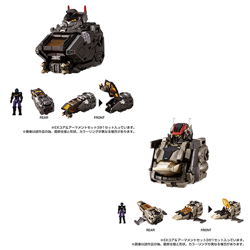 ゲイルヴァーサルター、ホルスヴァーサルターの新カラーリングボレットモジュールと、肩部装着パーツ、脚部装着パーツがセットになった「EXコア&アーマメントセット3」!ボレットモジュールのヘッドは新規造形で、ダイアクロン隊員Ver.2.0が1体、女性隊員が1体付属!
