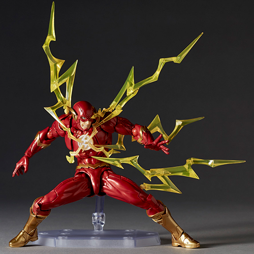 超高速で行動するDCヒーロー、フラッシュがアメイジング・ヤマグチから再び!アメイジング・ヤマグチでは代表的な二代目フラッシュ、バリー・アレンをフィーチャー。真紅のスーツにあしらわれた稲妻のシンボルを、鮮やかなイエローゴールドのメタリック塗装で仕上げられています。能力の高まりにより光速をも超え、時間移動さえ可能にするスピードフォースの力を表現するため、発動時に全身から発せられる稲妻のエフェクトパーツが付属。ジョイントで接続できる稲妻エフェクトは、大小14個が付属。左右の肩、背中、太もも、踵の8ヵ所に取り付けて、全身にまとう稲妻をを自由に表現可能。さらに、胸の稲妻シンボルや両目から走るスパーク、走り出す足元の輝きなどもエフェクトとして立体化。胴体の左右を分割することで両肩が前後に可動するギミックをはじめ、山口勝久氏が研鑽を重ねた全身可動による表現力の高いアクションに、通常顔の他に4種類が付属し幅広い演出が可能。