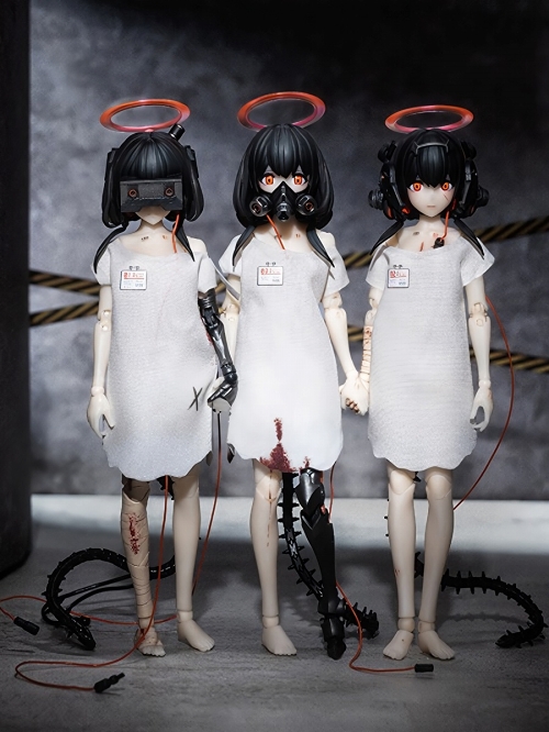 「SNAIL SHELL(蝸之殻)」による1/12スケールのアクションフィギュア新作は、イラストレーターのゼンマイブック氏のオリジナル「三猿」!フィギュア本体とは別に付け替えフェイスパーツが1個付属し、同じ容姿という設定上の「三猿」をイメージ。フェイスパーツには互換性があり、別の三猿にも取り付けが可能です。フェイスパーツはフル可動眼球付きで、付属の「視線替え用ミニツールNEO」で視線変更が可能。眼球には蛍光色、髪飾りとヘイローには蛍光材質を使用しているため、ブラックライトで照らすと発光します。フィギュア本体とは別に付け替え用ハンドパーツ3セットが付属。布製の服を着用し、ウェザリングや血痕、タグなどのディテールはすべてプリントで細かく再現されました。蝸之殻のシリーズ「バニーガール」アイリンと同じ引き出し式股関節を採用し、広範囲の可動を実現しました。「三猿」見ざる、聞かざる、言わざるが3体同梱となったプレミアムセットではかなりお得なプライス設定に!