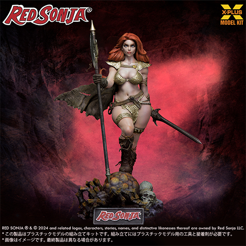 『英雄コナン』の世界観を基にしたコミックに登場する赤髪の女戦士「レッドソニア」を1/8スケールでプラスチックモデル化!自分より強い男以外には決して心を許さないと誓う彼女は有名なソードマスターの下で鍛錬を重ねた一流の女戦士。大勢の敵やモンスターが相手でも怯むことなく立ち向かう強い精神と戦闘力を持っています。そんな彼女の強くて美しい姿をモデルキットで再現。中でも身に纏うチェーンメイル(鎖帷子)のビキニアーマーは、猛々しくも艶やかな彼女の魅力をより一層引き立てます。巨大なアックスとソードに施された細やかな彫刻、ベルトやケープの質感にも注目ください。ジオラマ台座にはそれまで戦っていた巨大グモが横たわり激闘の熱冷めやらぬ様子を造形。敵を下したレッドソニアの表情や眼差しはまだまだ戦い足りない様子・・・。ぜひお手に取ってダイナマイトなプロポーションと戦いの熱気をご堪能ください!