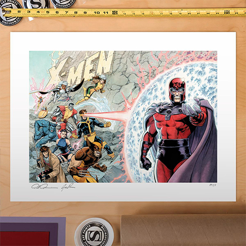 マーベルに多くのアートを提供してきたパオロ・リベラと父親で「ハワード・ザ・ダック」などにも携わったジョー・リベラによって、X-MEN60周年を祝い、ジム・リーの描いた1991年「X-MEN #1」をオマージュし描かれた、2023年「X-MEN #27」のバリアントカバーがサイドショウによってプリント化。プリント化するにあたりマグニートのアートも追加され完全なるオマージュとなった愛のある作品。