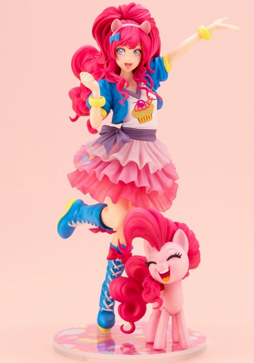 アメリカで社会現象を巻き起こしたあの『マイリトルポニー MY LITTLE PONY』がコトブキヤ「BISHOUJO」シリーズにラインナップ!第1弾は、おしゃべりとパーティが大好きなピンキーパイ!山下しゅんや氏によるアレンジで可愛く元気に登場です。ピンキーパイが大好きなカップケーキがプリントされたシャツに、ふわふわのフリルスカートはボリューミーかつ軽やかに再現。「エクエストリア・ガールズ」での姿をベースに、日本の「KAWAII」要素がたっぷり詰まった女の子になりました。ポニー姿での長い睫は立体造形!にっこり笑顔で、見ていると元気をもらえそう。2つの姿のピンキーパイで笑顔をもらってくださいね。
