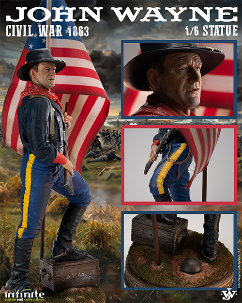 多くの戦争映画に出演し"アメリカの英雄"と称されるデュークこと名優ジョン・ウェイン。その名はアメリカ独立戦争での将軍「"マッド・アンソニー"・ウェイン」から取ったと言われるジョン・ウェインを1863年の南北戦争時代からインスピレーションを受け1/6スケールでスタチュー化。名優ジョン・ウェイン、そしてアメリカの歴史にリスペクトを送るアイテム。