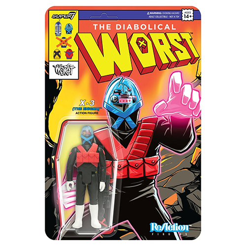 スーパー7の手掛けるリアクションシリーズからSDCC2024限定アイテムとして、80sキッズたちの「ぼくの好きなカッコイイやつ」感全開で展開する我らがスーパー7のオリジナルシリーズ「ザ・ワースト」が登場!こちらはロボット暗殺者「X」の第三世代で長距離攻撃を可能にした凶悪ロボ「X3ザ・エニグマ」。どこかで見たバックカードにどこかで見たカラーリング、X1からX5までどのキャラクターも最高にやりたい放題!3.75インチファンは要注目です!!