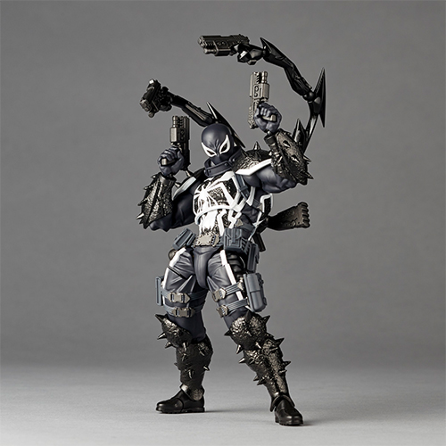 『スパイダーマン』の世界から、あのヴェノムのシンビオート(寄生生物)を新たに受け継いだヒーローがアメイジング・ヤマグチに再登場!政府管理のもとでヒーロー「エージェントヴェノム」としての新たな人生を得たフラッシュ・トンプソン。プロテクターとシンビオートが一体化し、失った足もシンビオートにより補った変身姿を、コミックのイメージで立体化。鋭いトゲの並んだプロテクター作り出す攻撃的なシルエットに、シンビオートが覆う表面のディテールも全身細かく作り込まれています。学生時代からアメフト選手として活躍してきた逞しい体躯は、山口勝久氏による独自の可動ギミックを満載して、コミックから飛び出したようなメリハリの利いたボディラインそのままにアクションが可能!組み換え可能な触手パーツと多数の銃器、ウェブや表情(目)パーツなど豊富な付属品も魅力的です。