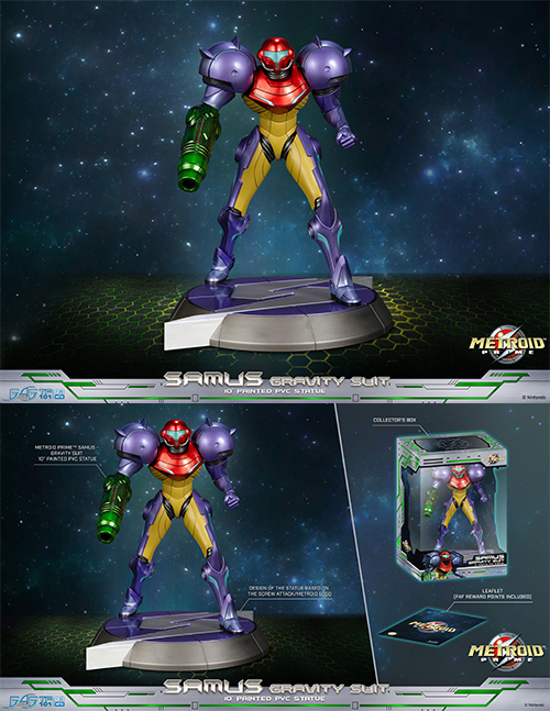 1作目『メトロイド』と2作目『メトロイドII RETURN OF SAMUS』の間の物語として描かれたゲーム作品『メトロイドプライム』より耐久性能が大幅に強化された機能強化型パワードスーツ「グラビティスーツ」を装着した主人公サムス・アランがPVCスタチューとなって登場です。グラビティスーツを象徴するカラーリングにもコダワリ、忠実に再現。台座には『メトロイド』シリーズやサムス・アランを象徴するマークとして知られる「スクリューアタック」がデザインされています。