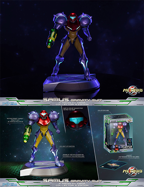 1作目『メトロイド』と2作目『メトロイドII RETURN OF SAMUS』の間の物語として描かれたゲーム作品『メトロイドプライム』より耐久性能が大幅に強化された機能強化型パワードスーツ「グラビティスーツ」を装着した主人公サムス・アランがPVCスタチューとなって登場です。グラビティスーツを象徴するカラーリングにもコダワリ、忠実に再現。台座には『メトロイド』シリーズやサムス・アランを象徴するマークとして知られる「スクリューアタック」がデザインされています。さらにこちらのコレクターズエディションには、スーツに搭載されたLEDによりヘルメット、アームキャノン、ストライプなどが発光しよりサムスらしさを感じることができます。(USBケーブルは別売りとなります。)