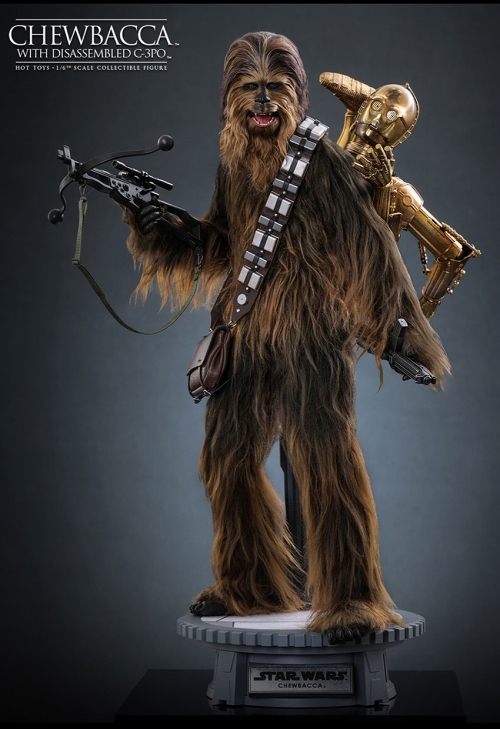 ホットトイズのムービーマスターピースシリーズに、『スターウォーズ』シリーズのエピソード5「帝国の逆襲」からチューバッカが登場。分解されたC-3POを背負ったチューイを、全高約36センチ、30箇所以上可動のフィギュアとして立体化。新規頭部には眼球可動ギミックが搭載され、さらに顎も可動。全身を覆う体毛は、リアルさを追求したふさふさ植毛仕様。ボウキャスターとブラスター、手錠、肩から下げる弾帯と携帯ポーチ、多彩なハンドパーツ、クラウド・シティ床面がデザインされた円形台座が付属。そして前述した分解C-3PO。トルーパーの射撃で半壊させられ、アグノートの手によりバラバラされたC-3POは、金属の質感を表現し、眼部にはライトアップを内蔵されるなど、こだわり仕様。上半身、脚に付けられた左腕、誤って取り付けた左脚、右足の4つのパーツに分かれておりネットで背負うことで、劇中のシチュエーションでのディスプレイも可能。