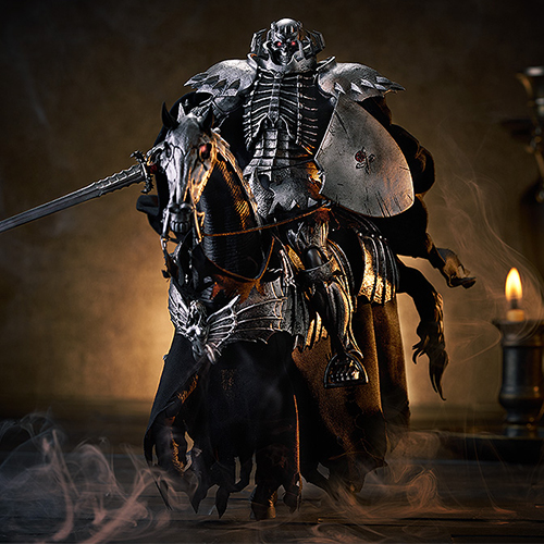 全世界で人気を誇るダークファンタジーの金字塔『ベルセルク』から、「5人の御使いに仇成す者」と自称し1000年間に渡りゴッド・ハンドや使徒と敵対している謎多き剣士「髑髏の騎士」が、人気のアクションフィギュアシリーズfigmaから登場です。その細部までの造形はもちろん、マントや腰衣は布製とコダワリを感じるアイテムに。オプションパーツとして「剣」「盾」「喚び水の剣」が付属。こちらは愛馬も付属したDXエディション。