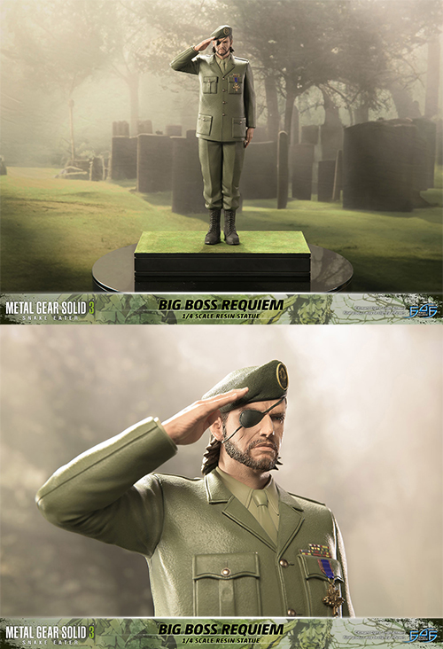 数々のゲームスタチューをリリースするファースト4フィギュアから、2004年にリリースされた『メタルギアソリッド』シリーズ3作目となる『メタルギアソリッド3 スネークイーター』のビッグ・ボスが1/4スケールスタチューとなって登場です。特殊部隊FOXHOUNDを設立し、「ザ・ボスを超えるボス」としての称号「ビッグ・ボス」を与えられた、主人公ネイキッド・スネークの姿をエンディングシーンからインスパイアを受けて立体化。全高約55cmとなる迫力のアイテム。