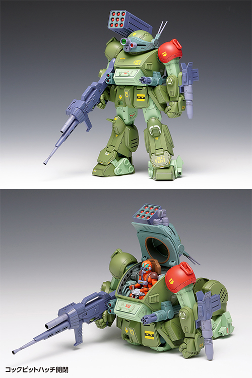 接着剤不要のスナップフィットタイプでWaveの贈る、『装甲騎兵ボトムズ』1/24スケールプラモデルキットシリーズ第二弾!数あるバリエーションの中でも、劇中の"吸血部隊"と恐れられた特殊任務班X-1が使用していたという設定から、スコープドッグの中でも特に人気の高い「スコープドッグ レッドショルダーカスタム」が登場。こちらはTVアニメ第10話で登場、第11話で活躍した左肩を赤く塗った機体を各種の武装とともに再現。スコープドッグ本体と同様に武装にも大河原氏による新たなディテールが加筆されたアイテム。コックピット、アームパンチ、降着機構、ターンピックのギミックと、ATの魅力を徹底再現した内容に加え、レッドショルダーカスタム仕様の特徴である9連ミサイルポッド、2連ロケットランチャー、ガトリングガン、ソリッドシューターが付属。