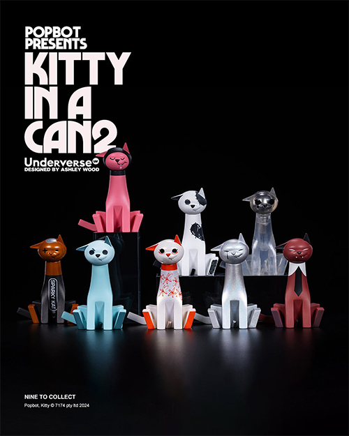アシュレイ・ウッドによりデザインされたとってもキュートなネコちゃんを1/6スケールで全高4インチ(約10cm)で立体化した「キティ・イン・ア・カン」。その名の通り、それぞれキャットフードをイメージした金属製の缶に入った素敵なトレーディングフィギュア。ヘッドパーツはマグネット式なので、左右への回転も可能。ラインナップは、Pink Juicer、Sparky K、Oh Yes!、ILMK、LOVE FLING、METAL TEAR、K-BORG、YOUR DEVIL、MR. KRUNKLE (Rare)の全9種。キュートなアート作品として気軽にディスプレイ出来るアートアイテム。