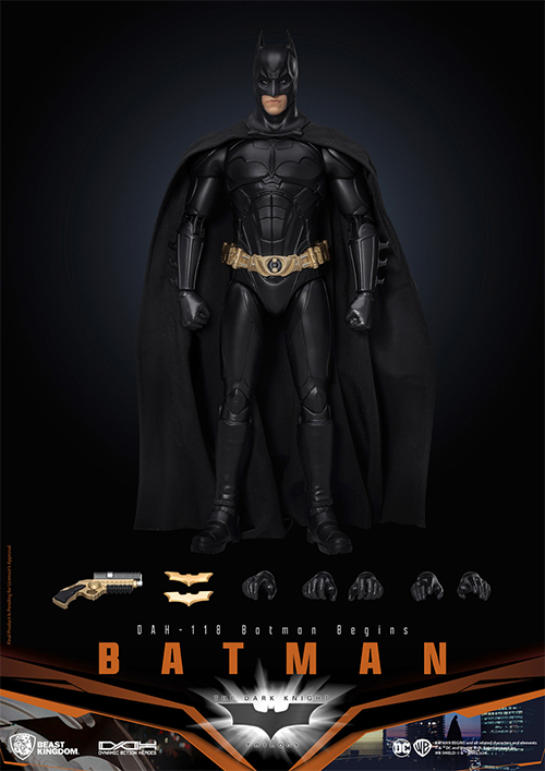 台湾のメーカー、ビースト・キングダムがお贈りする「ダイナミック・アクション・ヒーローズ」シリーズ。バットマン85周年を記念した特別パッケージで、2005年公開の映画『バットマン ビギンズ』から、バットマンが1/9スケールフィギュアで登場。全高約21cm、約22箇所が可動するアクションフィギュアとして立体化!演じるクリスチャン・ベールの特徴を捉えたヘッド、胸元のマークが印象的なスーツ、ゴールドのユーティリティ・ベルト、上質な素材を使用した布製のマントなど、ディテールや質感を細部まで再現。武器として、グラップネル・ガン、2つのバットラングが付属。