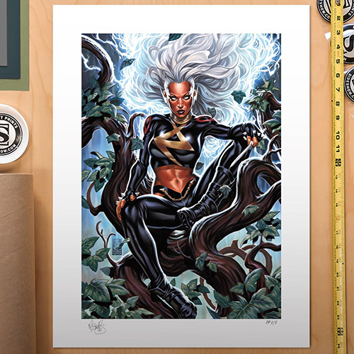 2022年、キーロン・ギレンにより書かれた『Immortal X-Men』シリーズ。ヒロインのストーム(本名オロロ・マンロー)がアーティストのマーク・ブルックスにより描かれたアートプリントで登場です!風に靡いたロングヘア―と、黒と金のモダンなコスチュームが印象的な一枚。ねじれた枝の間に腰掛け、彼女の視線の先にある景色も想像させます。X-Menシリーズのコレクションを更に豊かにさせるアイテムです!