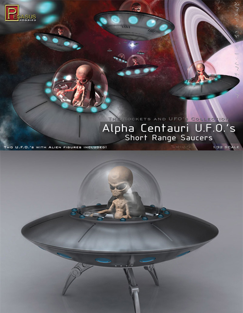 ペガサスホビーのUFOに乗るグレイ型エイリアン「アルファ・ケンタウリ星系 U.F.O. 短距離偵察型 2機セット」1/32スケールプラモデルキットが再び登場。円盤形のUFOとエイリアンはScott Willisによる完全オリジナルデザイン。ランディングギアを格納した飛行状態と、展開した駐機状態のどちらかを選択して製作可能。成形色はグレーとクリアパーツ。サイズは直径約9センチ。エイリアンフィギュア2体が付属。