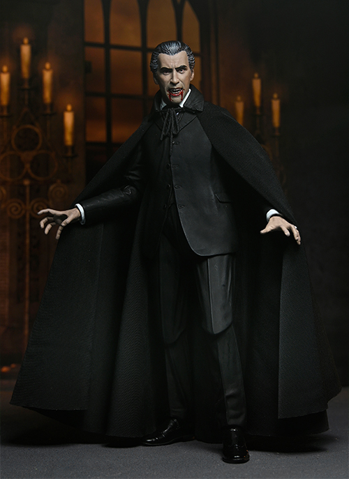 古典ホラー作品としてユニバーサルモンスターのキャラクターたちを現代に甦らせてきたネカが、ついに1950年代から70年代にかけてピーター・カッシングとクリストファー・リーの2大怪奇スターを生み出したハマー・フィルム作品に着手!記念すべき第一弾は1958年、初のカラーフィルムによるドラキュラ映画となった『吸血鬼ドラキュラ』にてクリストファー・リーが演じたドラキュラ伯爵!クリストファー・リーの出世作ともいえるドラキュラ伯爵の姿をネカらしくその雰囲気まで見事に立体化。アクセサリーパーツとして取り外し可能な布製のマント、交換可能な頭パーツなどが付属します。
