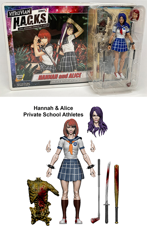 オリジナルの世界観が魅力のフィギュアを中心に展開してきたボスファイトスタジオが本格的に日本上陸!こちらはゾンビを題材とした「ウィトルウィウス H.A.C.K.S.シリーズZ」より、学業とスポーツを両立する私立学園でアスリートとして切磋琢磨する「ハンナ&アリス」の4インチアクションフィギュア。学んだ格闘技でゾンビを撃退する2人の姿を頭部付け替えパーツで表現。頭部パーツの他にも様々な武器、ハンドパーツ、スタンドが付属。