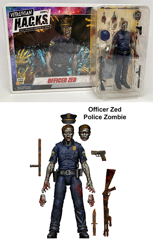 オリジナルの世界観が魅力のフィギュアを中心に展開してきたボスファイトスタジオが本格的に日本上陸!こちらはゾンビを題材とした「ウィトルウィウス H.A.C.K.S.シリーズZ」よりパンデミックの状況も知らず街頭でのケンカ対応に駆り出され、多くのゾンビ感染者となってしまった警察官の一人「オフィサー・ゼッド」の4インチアクションフィギュア。ゾンビ化してもなお、昔のパトロールルートを巡回するその姿を表現。替えのヘッドパーツに加え、警察官らしい武器やスタンドが付属。