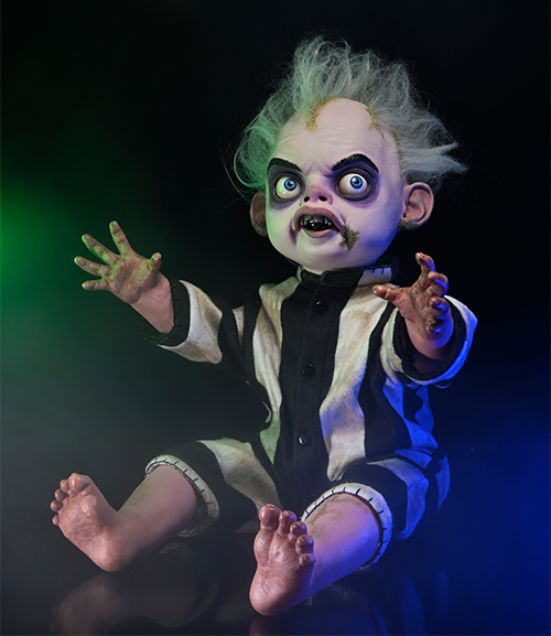 ティム・バートン監督がドラマ『ウェンズデー』のスタッフを引き連れ、新たに造り上げた映画『ビートルジュース ビートルジュース』から、どのような活躍を見せてくれるか、とっても気になるベイビー・ビートルジュースの1/1スケールレプリカがネカより登場。眼球可動や植毛、ファブリック素材の衣装にずっしりボディと存在感抜群。5ヶ所の可動ポイントもあるので、多少のアクションも可能です。世界5000個限定!