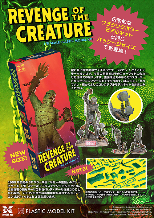 以前にエクスプラスよりリリースされた、1955年公開のSFホラー映画『半魚人の逆襲』のクリーチャー「ギルマン」1/8スケールプラモデルキットが、お馴染みの"クラシックホラーキット"たちと同様の縦長な特徴的なパッケージとなって再び登場。ギルマンは「半魚人」三部作の2作目となる『半魚人の逆襲』で、最も印象的なシーンであるフロリダのオーシャン・ハーバー海洋研究所に囚われていた姿をモデル化。スケールは1/8で、右手先端から台座まで全高約27.5センチ、ギルマン本体のみは頭頂部までで全高約22センチ。水かきの付いた特徴的な手、鰓を備えた頭部や全身を覆う鱗など、人間と魚が絶妙に交じり合ったデザインに。特に2作目ならではの目元の形状も注目です!これぞ組んでよし・飾ってよし・積んでよしのコレクタブルモデルキット!