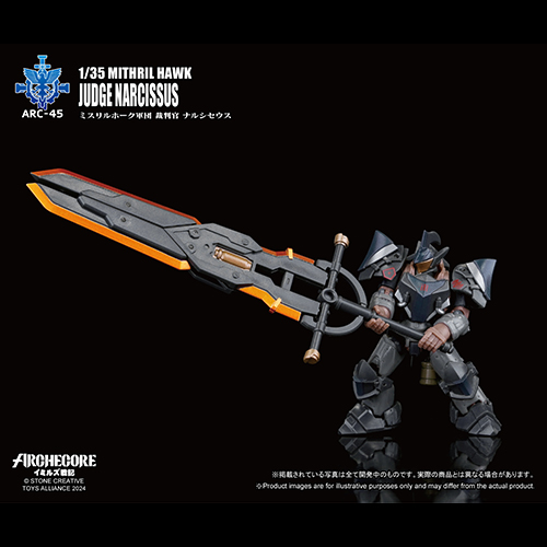 TOYS ALLIANCE LIMITED社企画製作の1/35スケールオリジナルSF可動玩具シリーズ『ARCHECOREイミルズ戦記』より、「ARC-45 ミスリルホーク軍団 裁判官 ナルシセウス」が登場が登場!屈強な城壁から全高約29cmの巨人ロボへと変形するロマンあふれるオリジナルアイテム。自分自身よりも大きな巨剣「ジャッジメント・グレイス」を手にジャッジを下す「裁判官 ナルシセウス」。剣は折りたたんで背中に背負うことが可能。