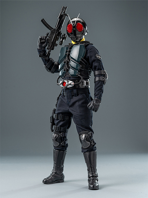 映画『シン・仮面ライダー』より「大量発生型相変異バッタオーグ」1/6スケールフィギュアとなって登場!ハイディテールな造形のヘルメットとライダー・ベルト、そして布製の手縫い衣装により、2023年公開の映画劇中の姿を忠実に再現。全身に32ヶ所以上の可動ポイントを持つフル可動フィギュアで、精密な造形、手袋とブーツにはウェザリング塗装も施されています。肘と膝にはプロテクターを装備し、大腿部にはピストル用のホルスターも装着可能。布製のマフラーは縁にワイヤーが入っており、表情付けが可能です。LED発光機能はヘルメットの目に搭載。マスクの顎部分「クラッシャー」は可動式で、口の動きに合わせて長さを調整できます。ブーツは交換式で、可動を重視して足首に分割があるものと、外観を重視して一体化されているものとの2種類が付属。また、映画の戦闘シーンを再現するためのサブマシンガンが付属するほか、サブマシンガンを保持するための手を含むポーズ違いの交換式手首パーツが5種類付属します。