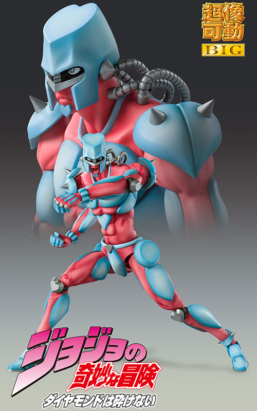 メディコス・エンタテインメントが放つ人気シリーズ「超像可動BIG」。『ジョジョの奇妙な冒険 第4部』より、主人公「東方仗助」のスタンド「クレイジー・ダイヤモンド」が全高約22cmのアクションフィギュアとなって登場ッ!!吉良吉影との最終決戦で致命傷を与えたガラス片や、承太郎と共に"鼠"を狩りに行った際に使用したライフルの弾丸など、豊富なオプションパーツが付属。全11種のハンドパーツと表情違いの頭部パーツにより、劇中の戦闘シーンも迫力満点に再現可能ッ!