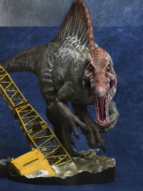 2001年公開の映画『ジュラシック・パークIII』より、「T-REXを倒した恐竜」として強烈な印象を残したスピノサウルスがプラモデルとして登場です。大きく強く凶暴な肉食恐竜を、エクスプラスが1/35スケールで立体化しました。軽量さと強度を併せ持つプラスチックモデルだからこそ表現できる「動き」が伝わるポーズを選択。ポリスタチューやPVCフィギュアでは難しいとされる片足立ちとすることで、動作の一瞬を切り取った臨場感や獰猛な鳴き声が聞こえてきそうな雰囲気が楽しめます。映画のクライマックスシーンをイメージしたジオラマ台座が付属。水中に沈んだクレーン車の大きさと比較して、スピノサウルスがいかに巨大な肉食恐竜であるかが分かるのもGOODです!